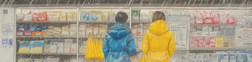Colored pencil sketch of a acting of place of rice small zipper bags in market, the atmosphere is market and rainy. their outfits are vibrant and colorful, they wear yellow rubber shoes and sloves. The layout of them must be symetric like Wes Anderson's film, which are so neat and symetric, bag are in the shelves and neat--ar 16:9--4K --ar 137:34