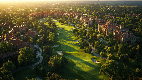 Create an image featuring an early 40s Korean male who is hesitant about going to a golf course due to the high costs. The scene should depict him standing at the entrance of a golf course, looking thoughtful or concerned. He should be dressed in typical golf attire, holding a golf bag, with the golf course visible in the background. The environment should reflect a premium and well-maintained golf course, but the man's expression should convey hesitation due to the cost. The overall atmosphere should capture the tension between his love for golf and the financial burden it imposes