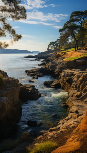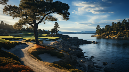 Very high-end exclusive Golf course. Well manicured course. Extreme low angle shot. Black and white with vibrant color splash. Ocean course. Blue-green water. Golden hour. Stylish. Important. Mysterious. Black and white. Shot with a Pentax. K-3 III Monochrome. --ar 4:7 --q 0.5 --s 750