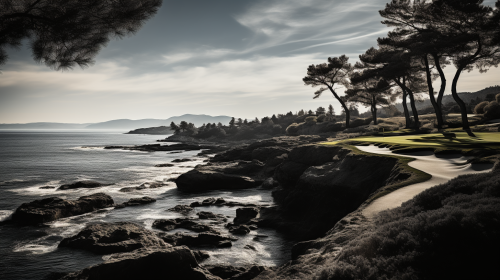 Very high-end exclusive Golf course. Cubist. Well manicured course. Extreme low angle shot. Black and white with vibrant color splash. Ocean course. Blue-green water. Golden hour. Stylish. Important. Mysterious. Black and white. Shot with a Pentax. K-3 III Monochrome. --ar 16:9 --q 0.5 --s 750