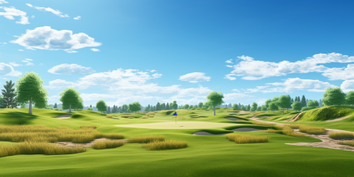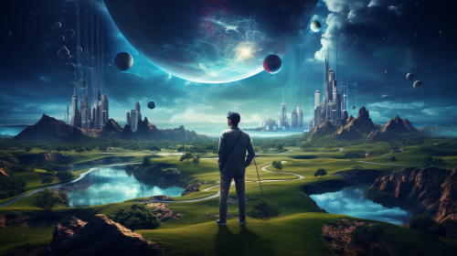 Wonderful golf course in imagination, back view of a man hitting a golf ball, movie scene, science fiction style --ar 16:9
