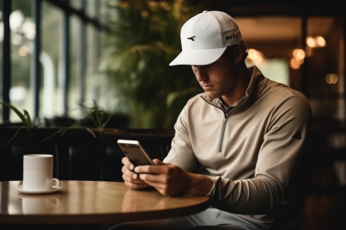 golf player wears a cap and sits in a cafe on the golf course and taps on his mobilephone, --ar 3:2