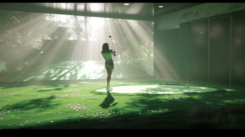 A large, modern, state-of-the-art golf simulator, brightly lit, occupies the center of the photo, with the screen displaying detailed images of the virtual golf course holes. In the center of the photo, a female model golfer is preparing to swing a golf club towards the floor in front of the screen, and there is grass in the center of the floor. realistic, CGI, VFX, SFX, DOF, F/22, FKAA, TXAA, RTX, SSAO, HDR, 8k, Hyper-realistic 4k --ar 16:9