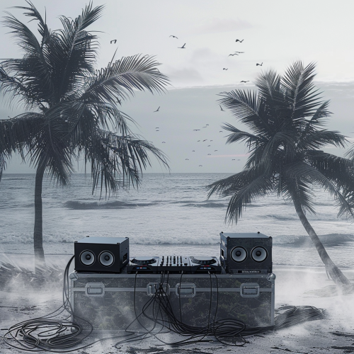 create an image of a beach featuring a dj booth and using tones of grey and colors #c8ff00 and #ff134a