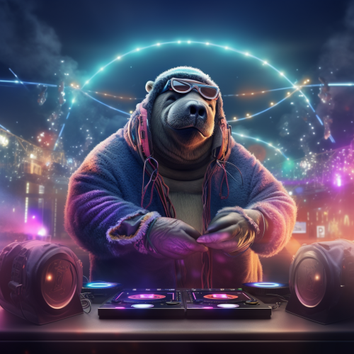 DJ walrus with headphones. He is playing music for a packed crowd. It is an EDM concert with flashing lights - 4k realistic, neon lights, at night, outside stadium