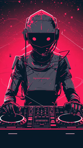 Locandina futuristica per evento di musica elettronica: robot DJ, stile grafico minimalista, colori vivaci, testo evento --ar 9:16 --v 6.0