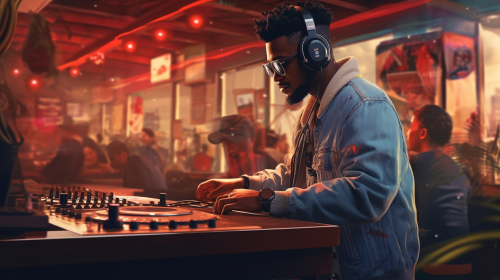 a dj playing music in a gas station for a group of people, Caribbean, dancing, excitement, urban, hip-hop, dancehall, realistic, --ar 16:9