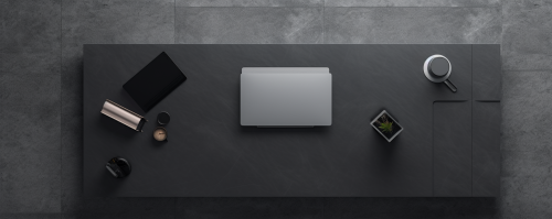 a black file on a grey desk, view from above, symetrical, sleek, --ar 5:2