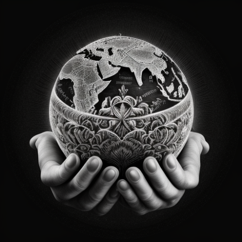 a globe with the world on it with two hands holding it in black and white, black background, Chiaroscuro lighting, fine intricate details --upbeta --v 4