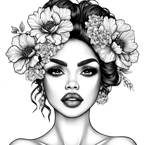 coloring book style, black and white color, picture, black fat beautiful woman with makeup, puffy lips, beautiful hairstyle, with flowers in her hair, white background --v 6.1