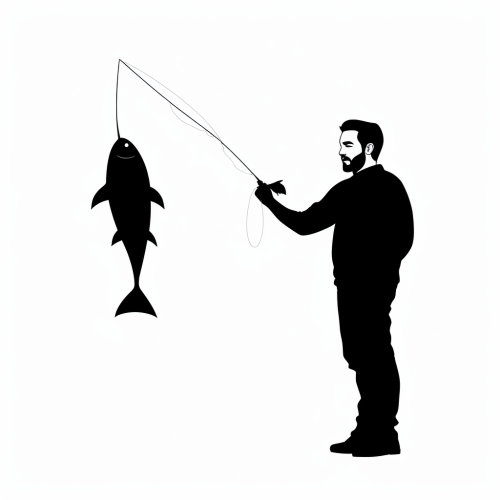 A black and white vector style image of a man standing with a fishing poll in his hands dangling a fish on the end of the line, in the style of cricut SVG cut files, white background, bold and thick. fillind in black outline, simple image, mid shot --v 5.2