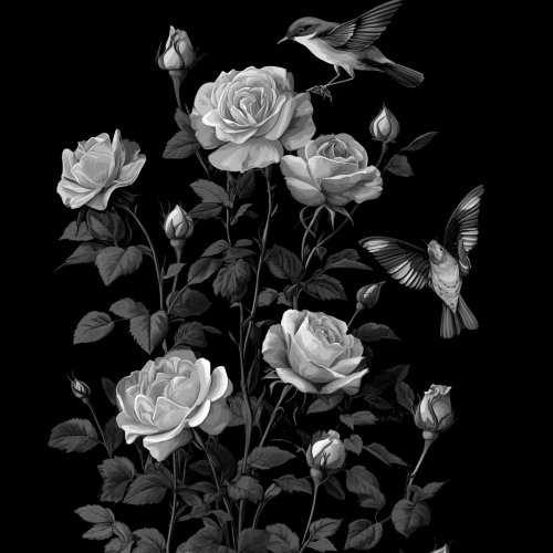 Des roses grimpantes avec papillons et oiseaux en image vectorielle et de couleur noir et blanc au format portrait avec quelques roses qui montent en hauteur