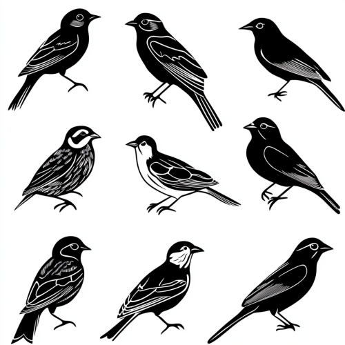 A black and white vector style image of various birds including Cassin's Finch, Wilson's Phalarope, House Finch,Spotted Sandpiper, Brewer's Sparrow, in the style of cricut SVG cut files, white background, bold and thick. fillind in black outline, simple image, mid shot