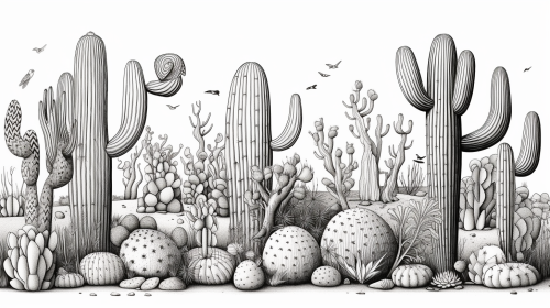 create a black and white outline of various cacti interspersed among huge rocks and dying dead foliage, remants of the Claret Cup cactus, the Peanut cactus , and the Saquaro cactus, and the Strawberry Hedgehog Cactus give this desert scene a natural realistic aura, a single owl sits on top of a cactus, detail the owl, black line OUTLINE ONLY, no shadows, white background only, realistic --ar 16:9 --c 5 --v 5.2