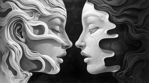 Two faces facing each other, intertwined, one white the other black, complementarity, reciprocity, mirror effect, surreal, engraving, black and white, --ar 16:9