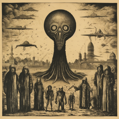old woodblock print of extraterrestrials visiting england in the middle ages. black ink on parchment paper