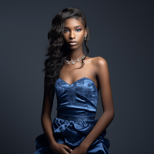 beautiful thin hispanic transgender woman, 25 years old, wearing formal dress, blue, beautiful makeup, full body shot, --ar 1:1