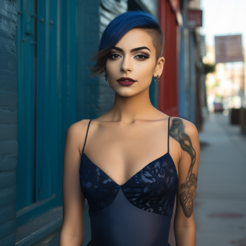 dating profile photo, beautiful thin hispanic woman, androgynous, 25 years old, wearing formal dress, blue, beautiful makeup, full body shot, --ar 1:1