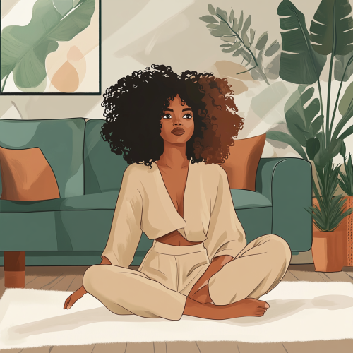 stylized illustration of a Black woman with voluminous, curly hair sitting on the floor in a modern, cozy living room. She is dressed in a neutral-toned loungewear set, consisting of a wrap-style top with long sleeves and matching pants, which accentuates her figure. Her pose is relaxed, sitting cross-legged on a soft, white rug. In the background, there is a teal sofa with several throw pillows, one of which is a muted red. The room is filled with various indoor plants, including a large Monstera plant to the right and other smaller plants in terracotta pots scattered around. The walls feature a framed abstract art piece with soft colors that complement the room's earthy and natural tones. The overall atmosphere of the image is warm and inviting, with a focus on comfort and a connection to nature through the abundance of greenery. The colors used in the image are mostly muted and neutral, contributing to the serene and relaxed vibe of the scene.