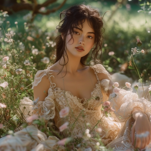 Visualize a high fashion photoshoot set in an elegant, French provincial garden during early spring. The model, a person of ambiguous ethnicity with refined features, is dressed in a classic, haute couture gown reminiscent of old-world luxury. The gown is an exquisite piece, embodying timeless elegance with intricate lace detailing, flowing fabrics, and soft pastel hues. The model's look is completed with minimal, sophisticated jewelry and a hairstyle that is both graceful and understated, echoing the romantic era. The garden setting is in full bloom, with delicate flowers and manicured greenery, providing a serene and luxurious backdrop. The lighting is natural and soft, capturing the gentle warmth of spring and the ethereal quality of the gown. The photo should appear as if taken with a top-tier DSLR camera, focusing on the delicate details of the gown, the natural beauty of the setting, and the model's poised expression. --ar 1:1 --v 6.0 --style raw --s 750
