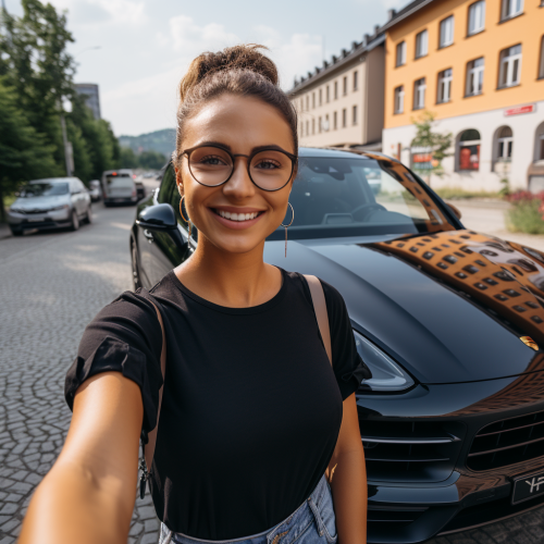 balck woman standing taking selfie with porsche cayenne, woman short black hair , on the road in township , basic dressed ,jeans, t shirt, high quality, there is a car that she takes photo with a porsche cayenne,black color, black color, ar 9: 16 --s 250