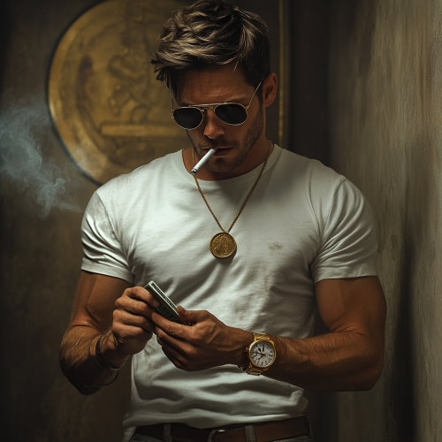 a dark faceless ghost that is wearing a black Nike tech fleece outfit with a vested puffer. He’s counting money on a pile of guns