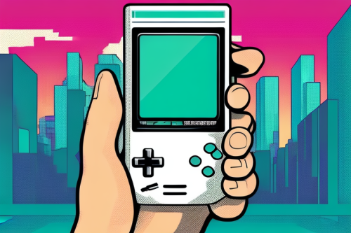 A hand holding a nokia cellular phone showing a blank white phone screen, pixel art style, 16-bit, 2D, retro, illustration, vaporwave, cityscape background --ar 3:2 --q .25 --v 4