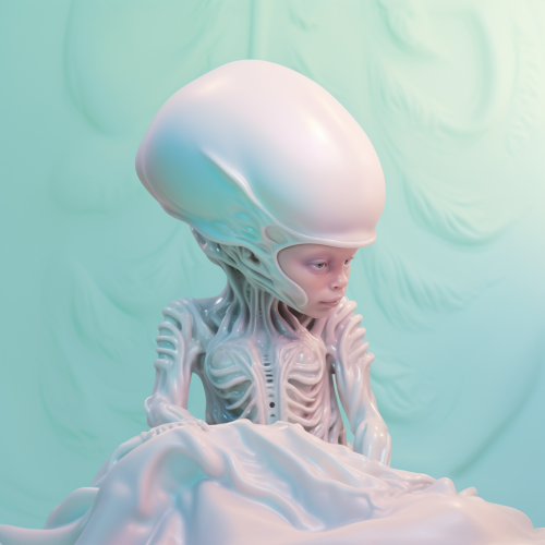 a haunting, alien xenomorph creature having symbiotically fused with fungi-like organisms. with the xenomorph-mushroom hybrids as the focal point in a dark ambient background . strange, sci-fi alien xenomorph, surreal carbon based life form concept, --ar 4:5 --c 10