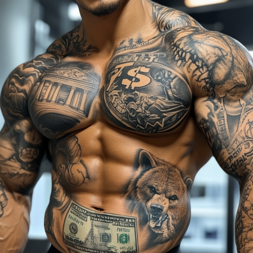 tattoo pattern of a big muscle wolf man, with tatoos all over his upper body depicting the NYSE, Wall ST, a red bear, a green bull, $, $100 American bills, realistic, tattoo style, realism, blackwork