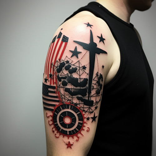 an image of tattoo with no background. the tattoo should be a combination of the american flag and the portuguese flag. mix airplane themes and geometric lines through. blackwork style, no skin textures.