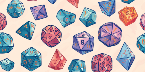 Hand drawn illustration of d20 dice pattern colorful, vibrant, clean, minimal, pattern image full frame --ar 2:1