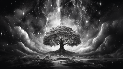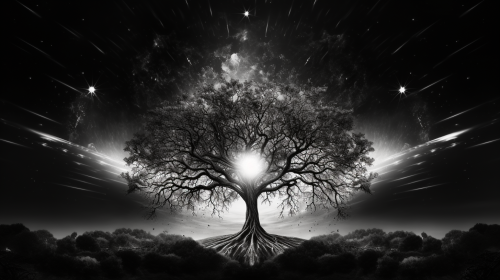 cosmic tree of life, space background, black and white filter, black and white, J Augustus Knapp art style --ar 16:9