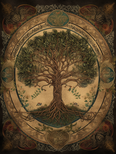 medieval tree of life, Woven blanket graphic, symmetrical, pictorial space, digital handpainted illustrations, woven rug design --ar 4:3 --v 5.0 --upbeta