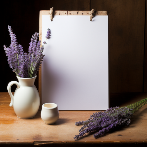 antique sheet of blank paper near ceramic water jug and vase of lavender, bright natural lighting