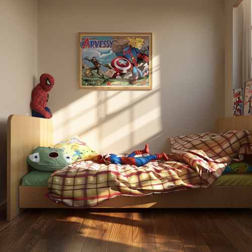 realistic photo of a child's bedroom shot on a Canon 1D. the child is a marvel fan. blank flat wall with empty space at the back --v 6.0
