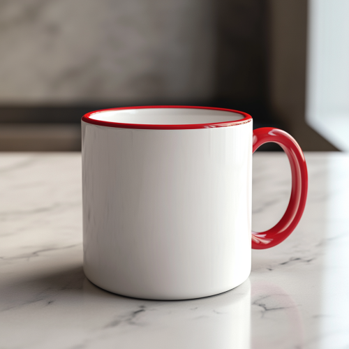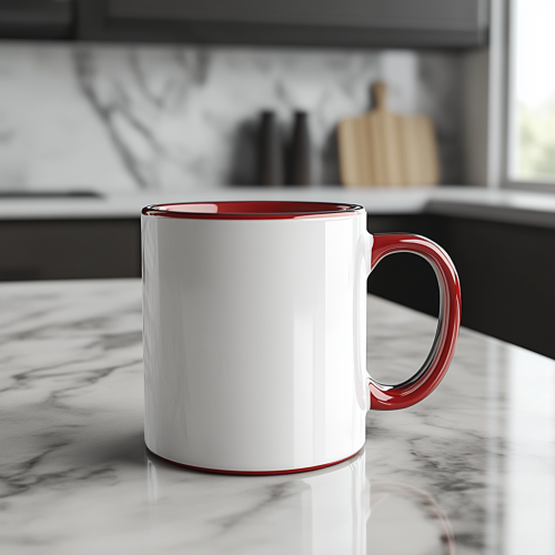 Mug mockup blank mug white mug red rim mockups minimalist background , coffee mug mock up blank mug mockups product mock up mug mockup, modern kitchen, dark cabinets, marble counters and beautiful cabinets. photos 11oz. High resolution.