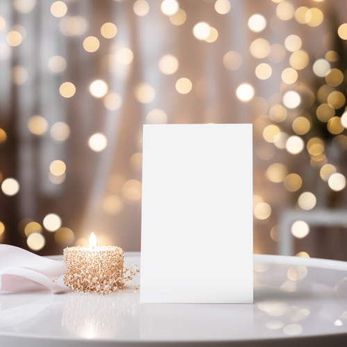 mockup for zoomed in blank empty white 5" x 7" card on white table, white curtains and fairy lights in background, bright daylight light from front, closeup, Glamor Shot, close up picture with blurred background, high definition