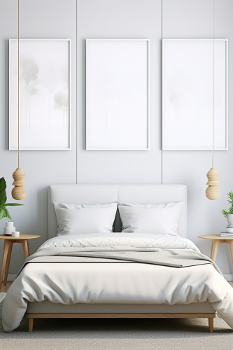 Hyper realistic picture of cosy bedroom with a white blank wall with three empty vertical sized frames. 8k. --ar 2:3