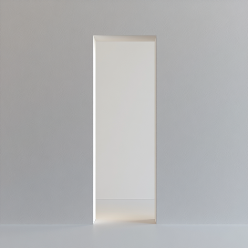 An ultra-clean, minimal shot of a blank white wall with a rectangular cutout space in the center. This cutout is the focus, ready for the wallpaper design. The wall is in sharp focus, with the camera angle positioned at eye level, as if a person is standing right in front of it, allowing the viewer to inspect the wallpaper closely. The lighting is neutral and even, emphasizing the texture and finish of the wallpaper without any other elements in view.