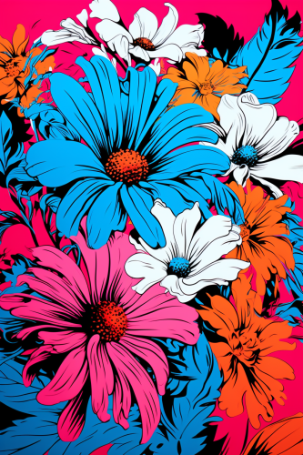 Pop art-inspired print, bold neon-colored botanical elements, oversized daisies, electric blue leaves, fluorescent pink roses, vibrant background, eye-catching colors, 1980s neon aesthetic, high contrast, dynamic visuals, retro vibes, electrifying palette, vivid nostalgia, artistic boldness, Art by Andy Warhol, Pop Art Aesthetics by Roy Lichtenstein, Neon Colors by Patrick Nagel --ar 2:3