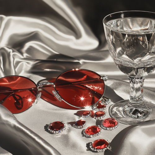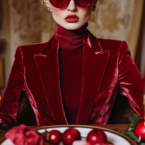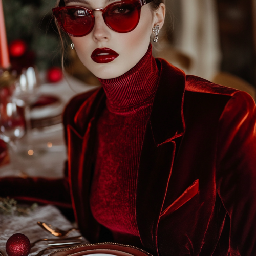 holiday editorial minimal tablescape, with jewel tone fabrics, close up view of the table setting, with a person wearing a red velvet blazer and turtleneck, focus on the torso area and table setting, fashionable red sunglasses resting on the table as a focal point