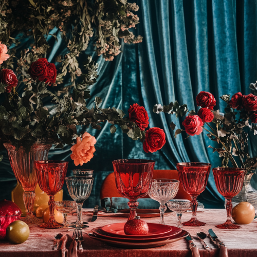 retro holiday tablescape with jewel tone velvet curtains in the background, tablescape with red glasses front and center, editorial, product photography