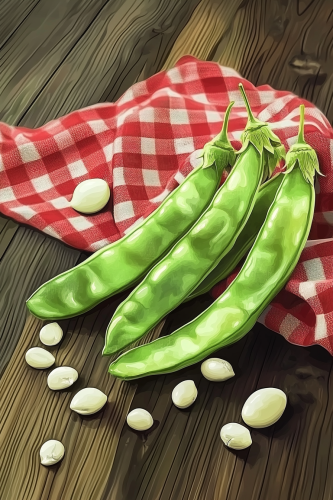fresh green broad beans, and white colored, on the table with a red checkered cloth. A few loose bean seeds are scattered around them. The background wooden table creates an atmosphere of spring or summer dining, natural light. It has high sharpness and clear focus. --ar 2:3 --style raw