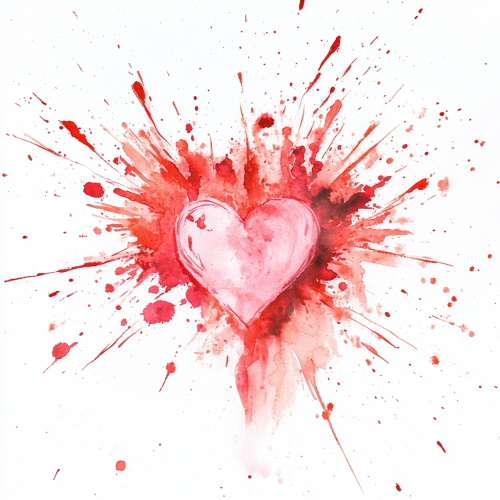 An illustration image with a small, central pink heart that appears to have been painted with watercolors on a white background, with red paint spreading out in all directions from the center of the heart.