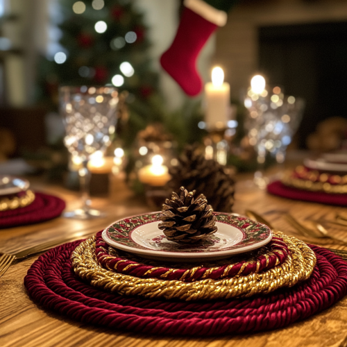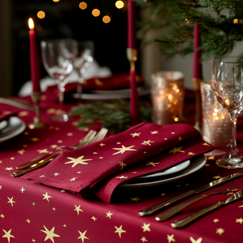 A beautifully set table with a red tablecloth and golden cutlery, surrounded by twinkling candles. Add light reflections on crystal glasses and create a festive background with garlands and hanging decorations, enhancing the celebratory vibe. --ar 16:9