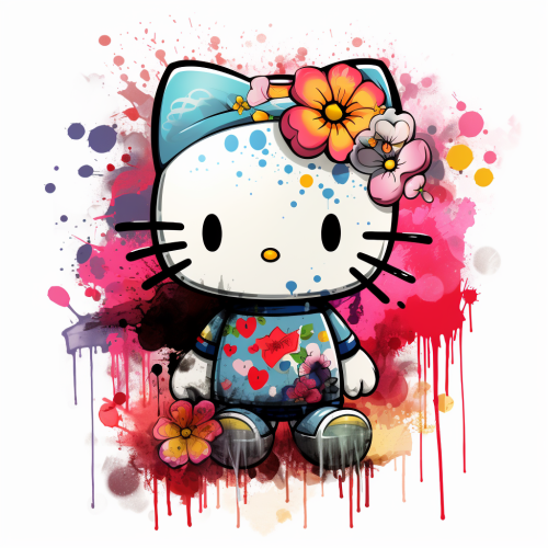 Africa American Hello Kitty with clothes on in graffiti with paint splatter with color paint splatter flowers all around transparent background