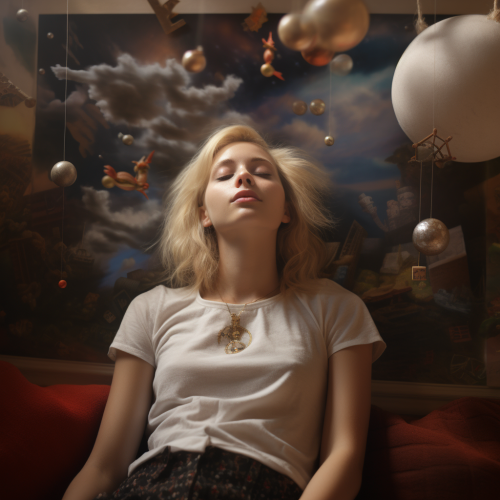 an underwater photograph of a beautiful woman with long flowing blond hair flowing languidly in the water. Shafts of sunlight slant in from above. --ar 1:1 --style raw --v 6.1
