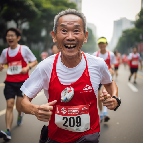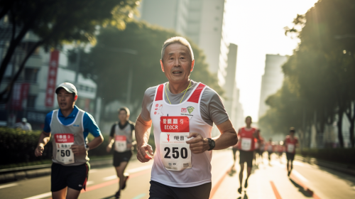 A man in his 50s in Asia is running a marathon. The man is wearing a name tag bearing the number 52 in his marathon attire. Next to him, the pacemaker is running with a bright face. The pacemaker is a man in his 30s and wears a dress shirt and a tie. crane shot, nijji --ar 16:9 --style raw