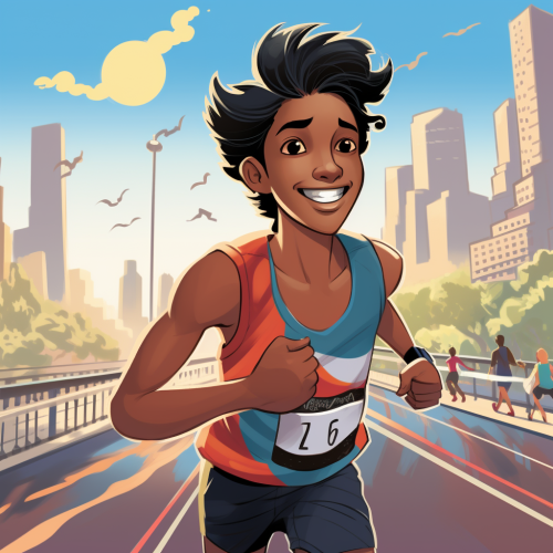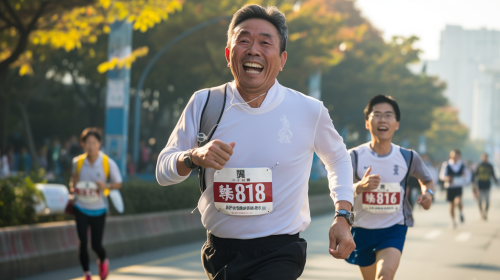 A man in his 50s in Asia is running a marathon. The man is wearing a name tag bearing the number 52 in his marathon attire. Next to him, the pacemaker is running with a bright face. The pacemaker is a man in his 30s and wears a dress shirt and a tie. ar-- 16:9 --style raw