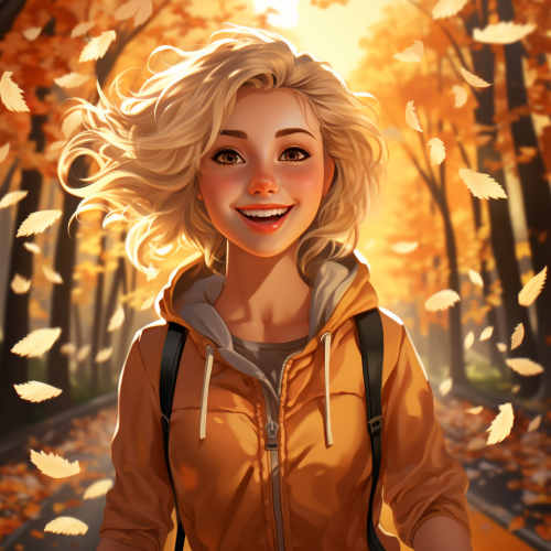 head to feet of a happy running blonde woman with very short hair, wearing athletic wear, running on a road in fall in style of pixar --s 1000